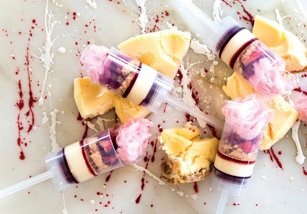 6. Cut half of the cheesecake once cooled, remove the biscuit base and beat the cheesecake until smooth. You will then have just the cheesecake mixture for piping into the push pop.