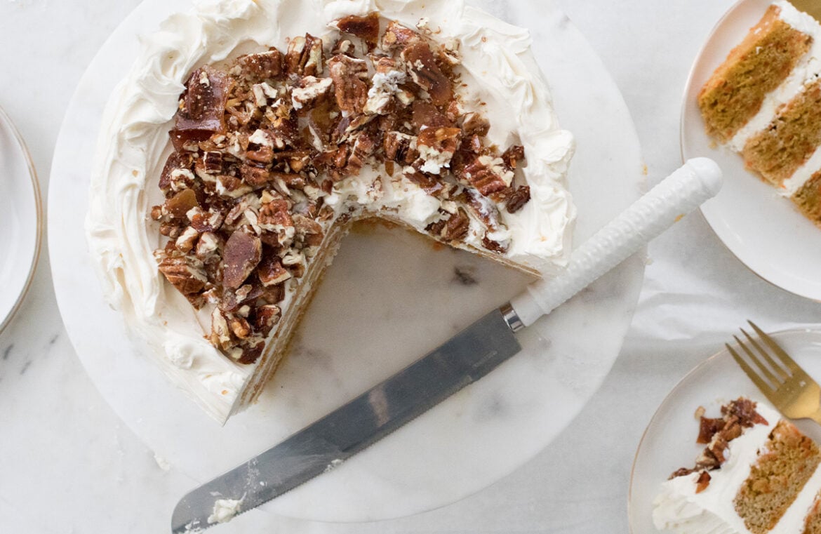 Place one layer of the cake on a turntable or serving plate. With an offset spatula, spread the top evenly with 1½ cups [450 g] of the buttercream. Place the second layer on top, and frost with another 1 cup [300 g] of filling. Place the third layer on top and frost the cake, topping with the candied pecans, if desired, and serve. Store the cake, covered, in the refrigerator for up to 1 day.