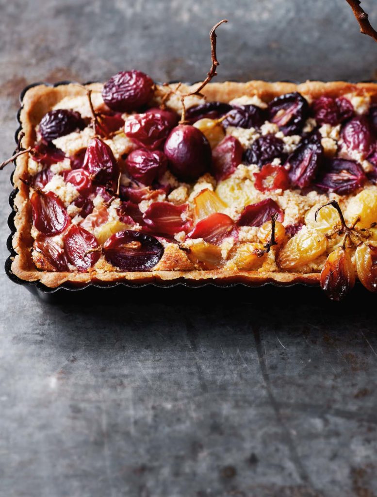 Spread the almond cream over the pastry. Pick the majority of the grapes from the stalks and arrange over the cream. Finish by garnishing with a few grape clusters.