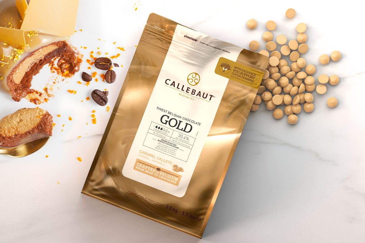 In development for two years. Callebaut’s GOLD is a white chocolate with caramelised milk powder and caramelised sugar, which gives it the golden colour and toasted caramel flavour. The addition of salt creates a perfect balance to offset the sweetness.