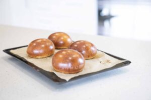 Preheat your oven to 185°C fan-forced. *When the buns are fully proofed, carefully brush them with egg wash then bake for 14 minutes until golden, shiny brown, giving the oven a good burst of steam for the first few seconds of baking.