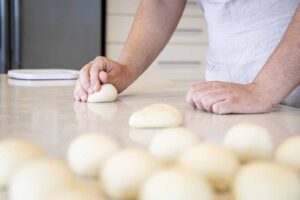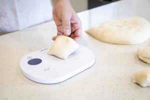 Divide the dough into 100g pieces, de-gas any large bubbles and shape into tight rounds.