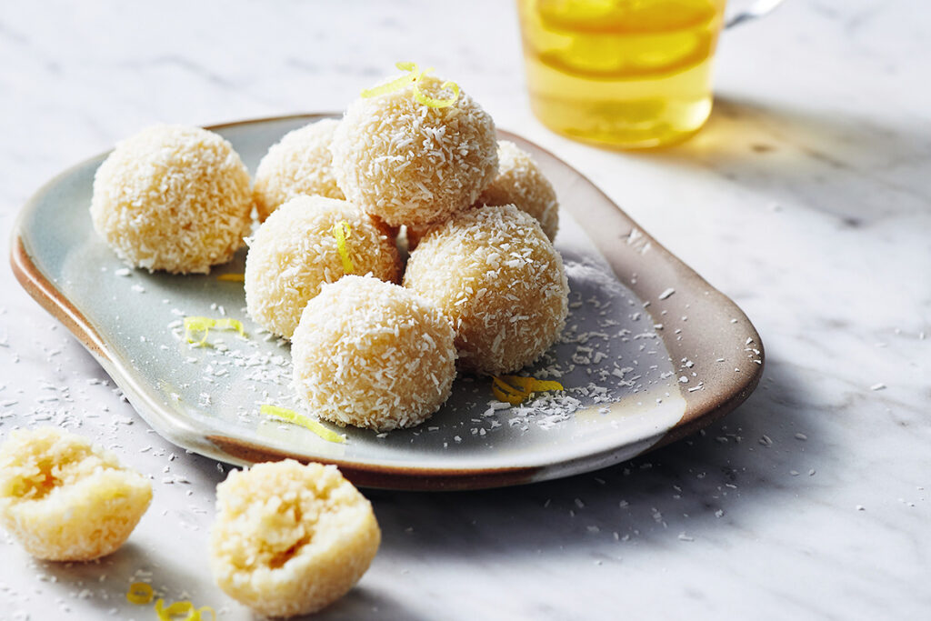These balls are the ultimate bite-sized version of a lemon slice Luke Hines’s nan used to make him. He’d go to her house and there it was: a nutty coconut base topped with a creamy lemony icing. He never could resist. Here’s a really quick and simple way to re-create that flavour combination for the perfect snack any