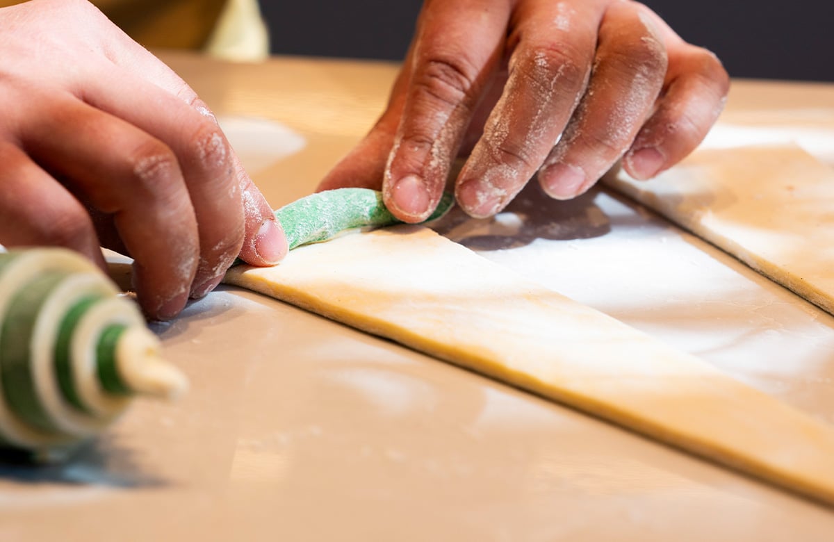 This is not matcha — it’s a tinted dough strip for visual identity.