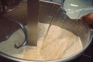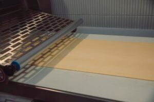 Place flour and salt into a food processor. Turn on and slowly pour in the water. Remove from the food processor once blended. On a clean surface, dust with flour. Roll out your dough to an approximately 1cm thick rectangle.