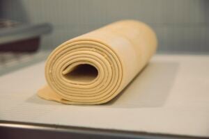 Use baking paper to roll your butter out to a plaque. Put your butter plaque in the centre of your dough and fold over the right and left sides of the sheet of dough, overlapping in the middle. Using a rolling pin, roll out the dough blending the soft butter.