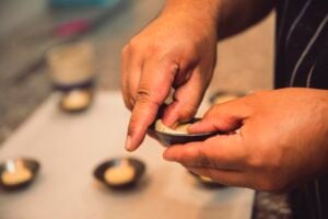 Using a saucepan, bring the milk, lemon zest and cinnamon to the boil. As the milk has boiled, whisk in sugar and flour, slow and steady. Keep stirring, the milk will become thick! Take off the heat and allow to cool, then mix egg yolks through and stir well. Cut approximately 20g pieces off the pastry role. Place into your tart moulds.