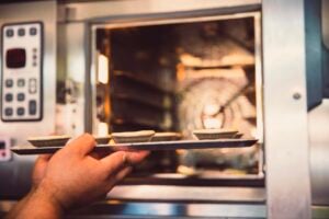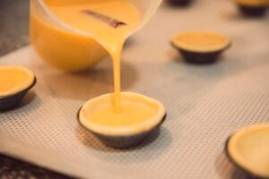 Space out the moulds across a baking tray. Pour your custard into each mould.