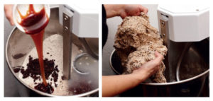 1. Measure ingredients: Beginning with the starter, weigh and place the wet ingredients including the sprouted quinoa into the dough machine bowl. Then weigh and add your dry ingredients, except salt.