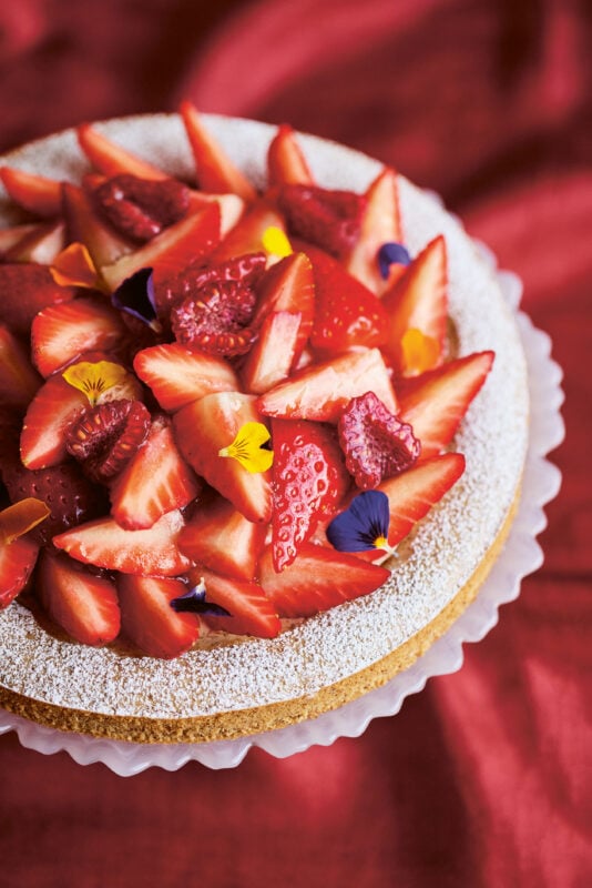 Imagine a sponge cake that rises beautifully in the oven, only to collapse upon cooling – but intentionally. This recipe creates a naturally sunken centre, forming a delicate basket for silky crème pâtissière, fresh strawberries and a glossy clear glaze. The edges remain slightly crisp, while the interior stays tender and dense, making for a unique yet elegant dessert.