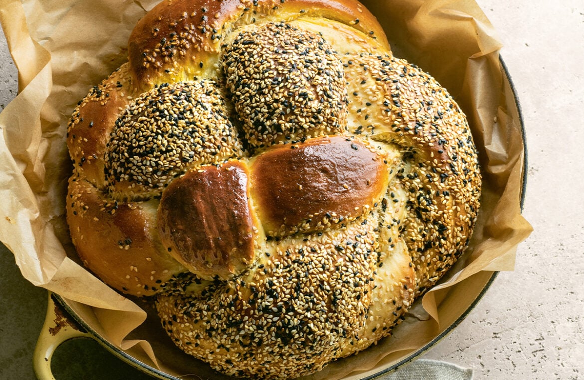 Glaze the non-seeded portions of the challah a second time. Bake until the bread is golden brown, about 35 minutes. You can also test the challah for doneness by tapping it and listening for a hollow sound.