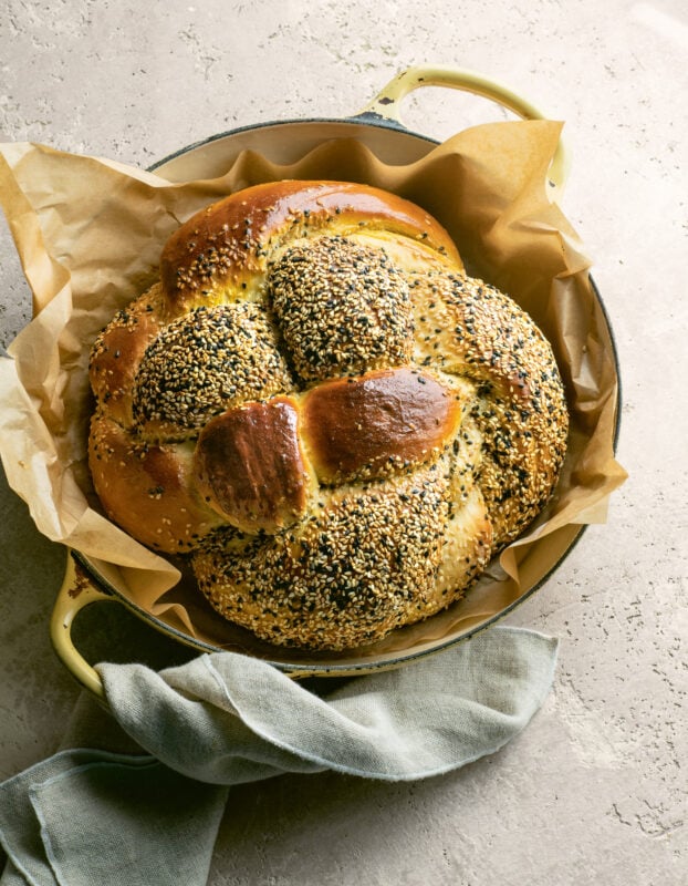 Eating challah on the Friday night Sabbath is a treasured ritual and family tradition. If there is one recipe in this book that most defines the intersection of my cultural and culinary identity, it would be this one. Making challah feels personal. It feels meditative. And it’s a tradition I hope my children will share with the next generation. I particularly love the symbolism of making a round, sweet challah on Rosh Hashanah, the Jewish New Year. The round shape represents the infinite cycle of life, offering a moment for reflection and redemption as one year ends and a new one begins. I always eat challah on the day it is baked, preferably while still warm from the oven! But, I also enjoy having a few slices left over to make French toast for Saturday breakfast.